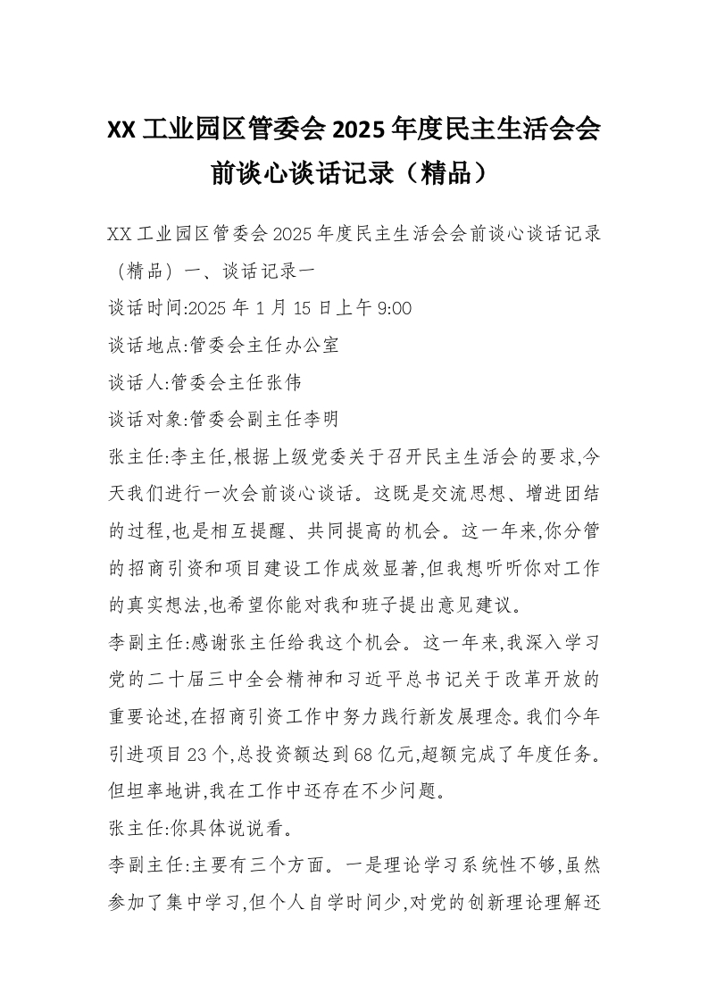 XX工业园区管委会2025年度民主生活会会前谈心谈话记录(精品)