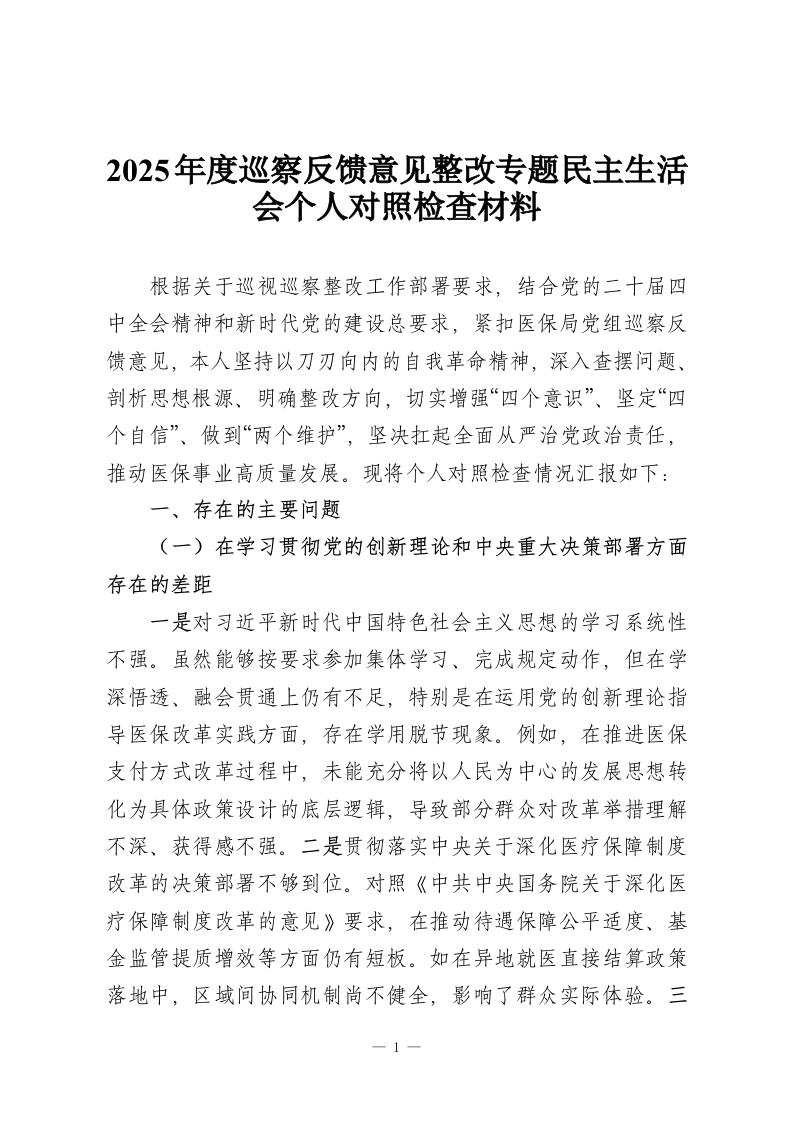 首页讲课讲稿2025年度巡察反馈意见整改专题民主生活会个人对照检查材料
