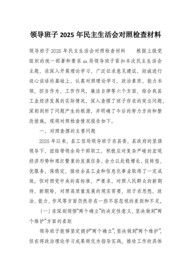 首页工作文档领导班子2025年民主生活会对照检查材料