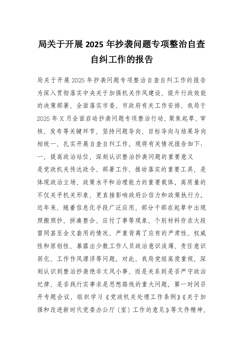 局关于开展2025年公文抄袭问题专项整治自查自纠工作的报告