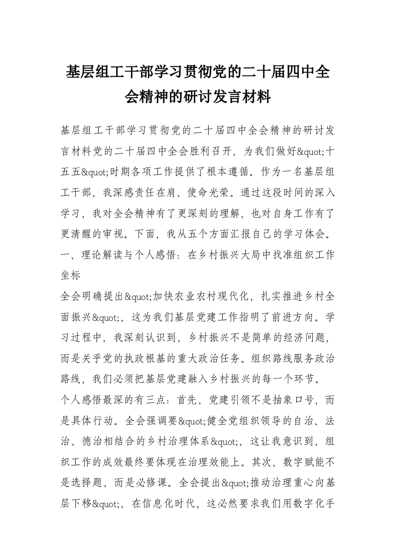 首页讲课讲稿基层组工干部学习贯彻党的二十届四中***精神的研讨发言材料