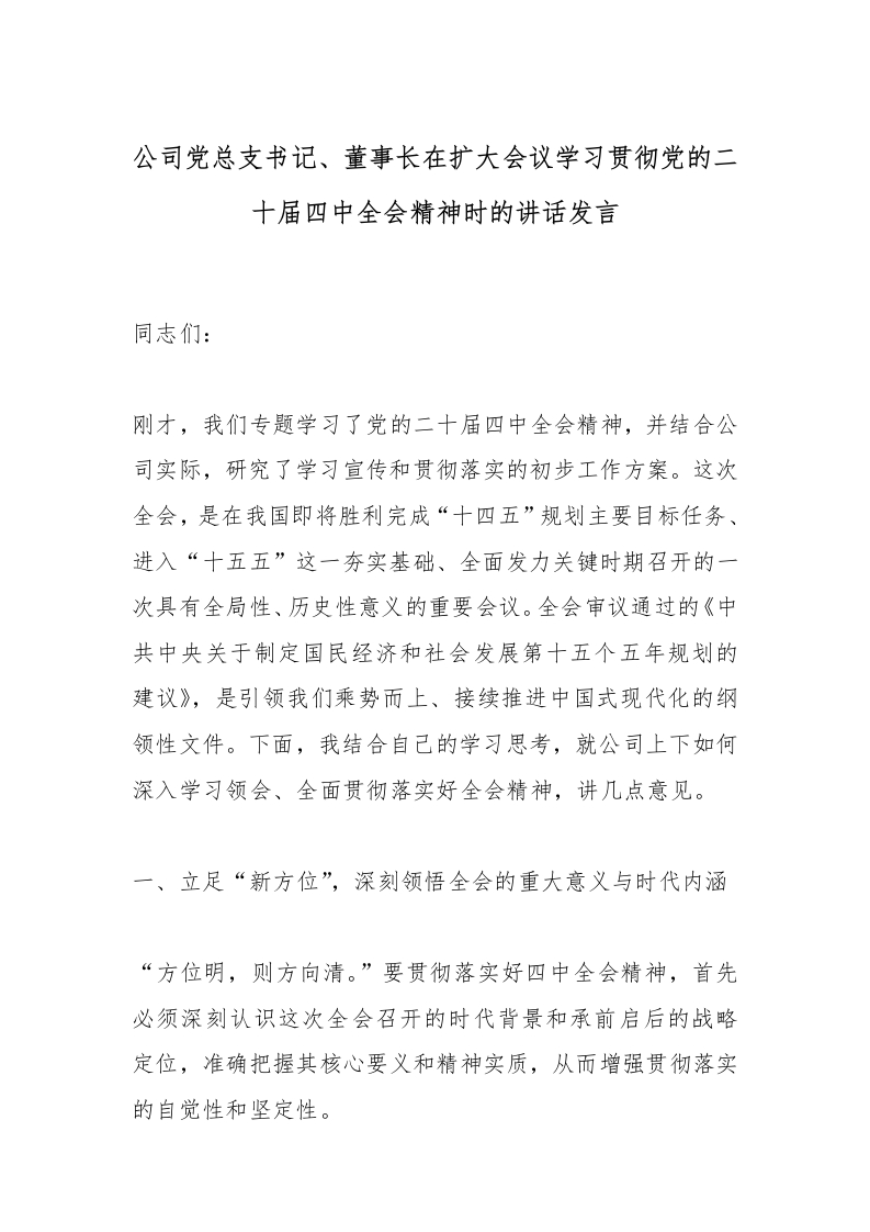 公司党总支书记、董事长在扩大会议学习贯彻党的二十届四中***精神时的讲话发言_副本