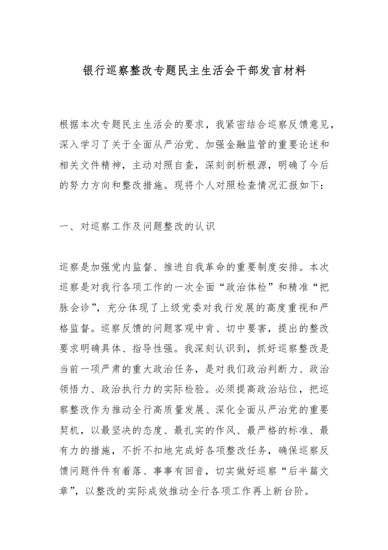 首页精选范文银行巡察整改专题民主生活会干部发言材料_副本