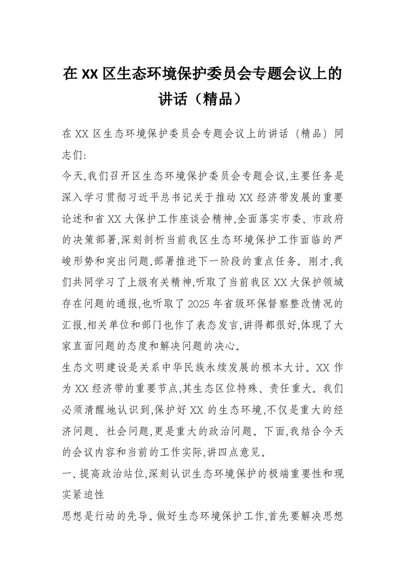 在XX区生态环境保护委员会专题会议上的讲话(精品)