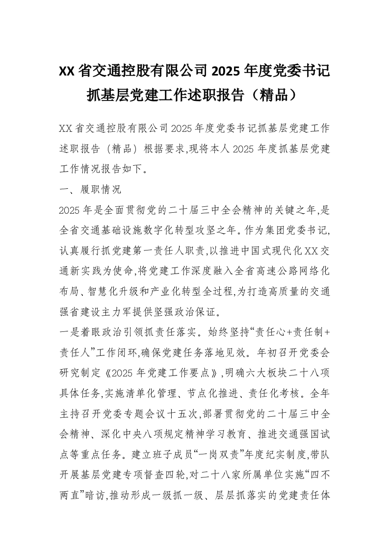 XX省交通控股有限公司2025年度党委书记抓基层党建工作述职报告(精品)