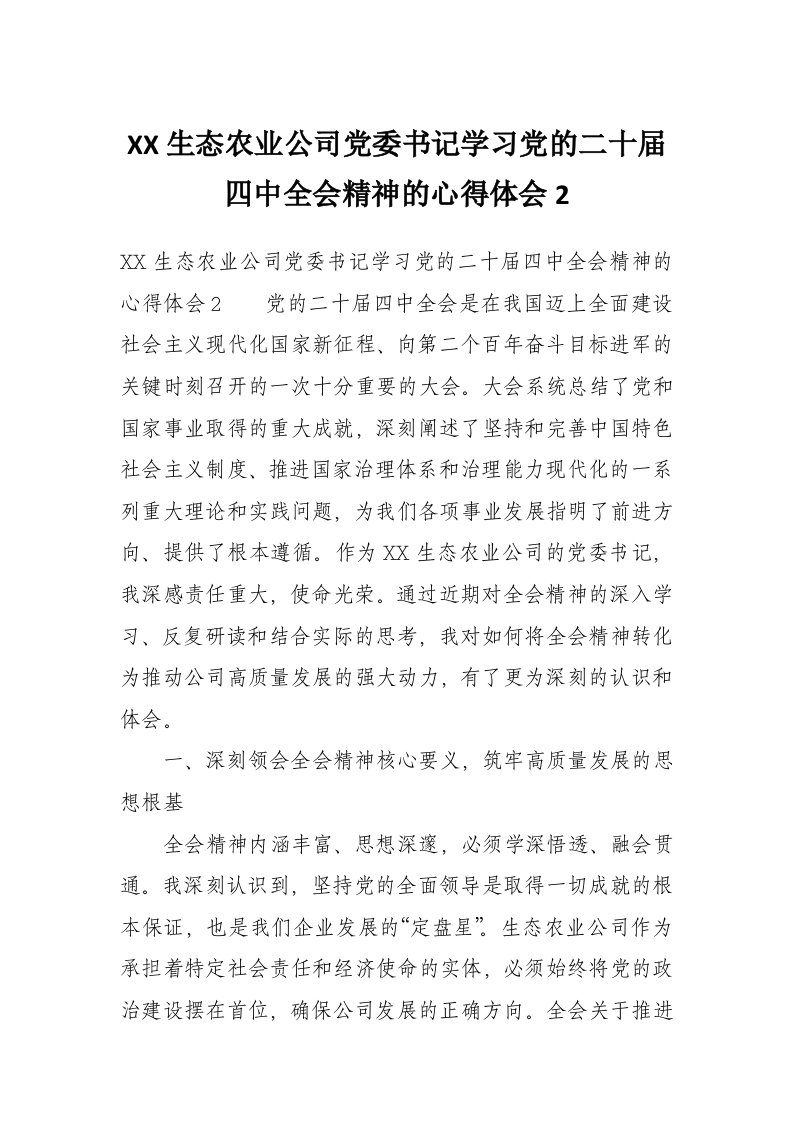 XX生态农业公司党委书记学习党的二十届四中***精神的心得体会2