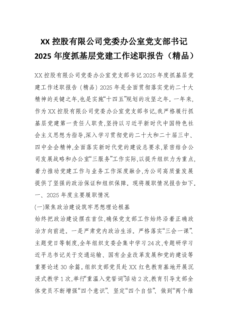 XX控股有限公司党委办公室党支部书记2025年度抓基层党建工作述职报告(精品)