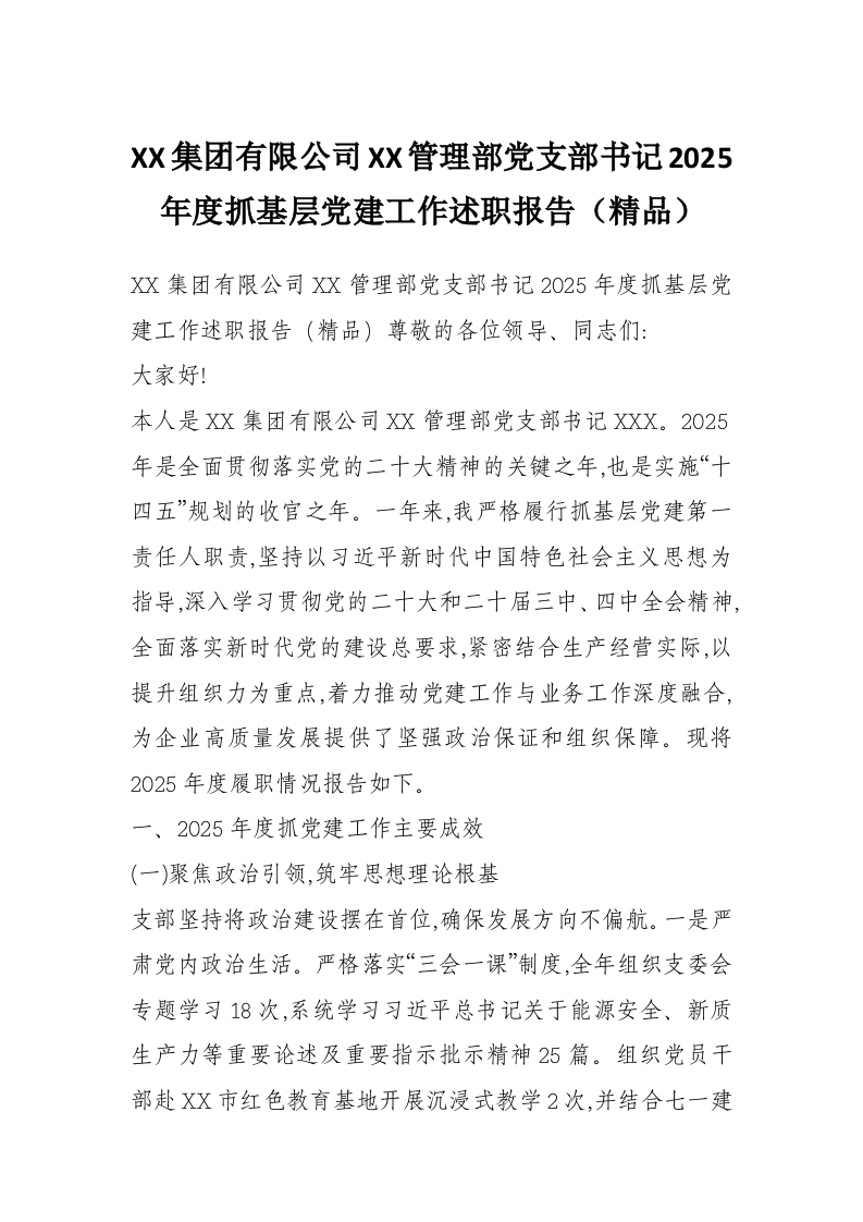 XX集团有限公司XX管理部党支部书记2025年度抓基层党建工作述职报告(精品)